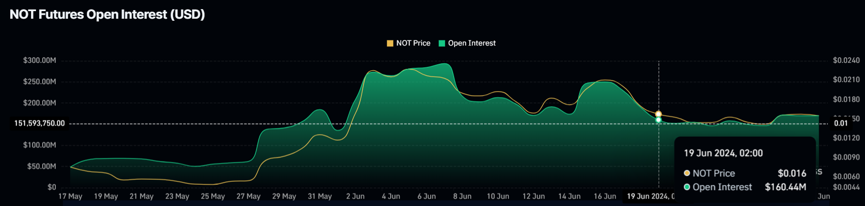 Giá của Notcoin đang cố gắng đạt được một bước đột phá, và đây có thể là kết quả có khả năng xảy ra, xét đến sự thay đổi trong tâm lý của nhà đầu tư. Một tuần trước, open interest của Notcoin đã giảm đáng kể, giảm 70 triệu USD. Mặc dù có sự sụt giảm này, nó đang bắt đầu cho thấy dấu hiệu phục hồi, hiện tại là 151 triệu USD.