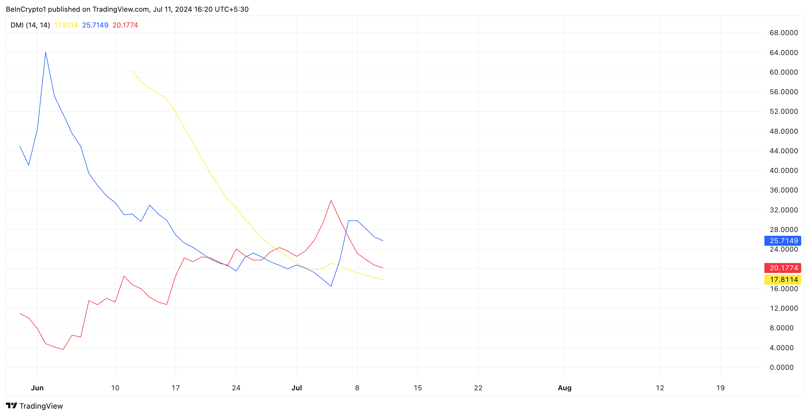 Chỉ số DMI của Notcoin (NOT) xác nhận sự trở lại của xu hướng lạc quan đối với Altcoin này. Chỉ báo này đo lường xu hướng và hướng giá của tài sản. Nó bao gồm chỉ báo hướng tích cực (+DMI), chỉ báo hướng tiêu cực (-DMI) và chỉ báo hướng trung bình (ADX). +DMI đo lường sức mạnh của các chuyển động giá lên, trong khi -DMI đo lường sức mạnh của xu hướng giá xuống.