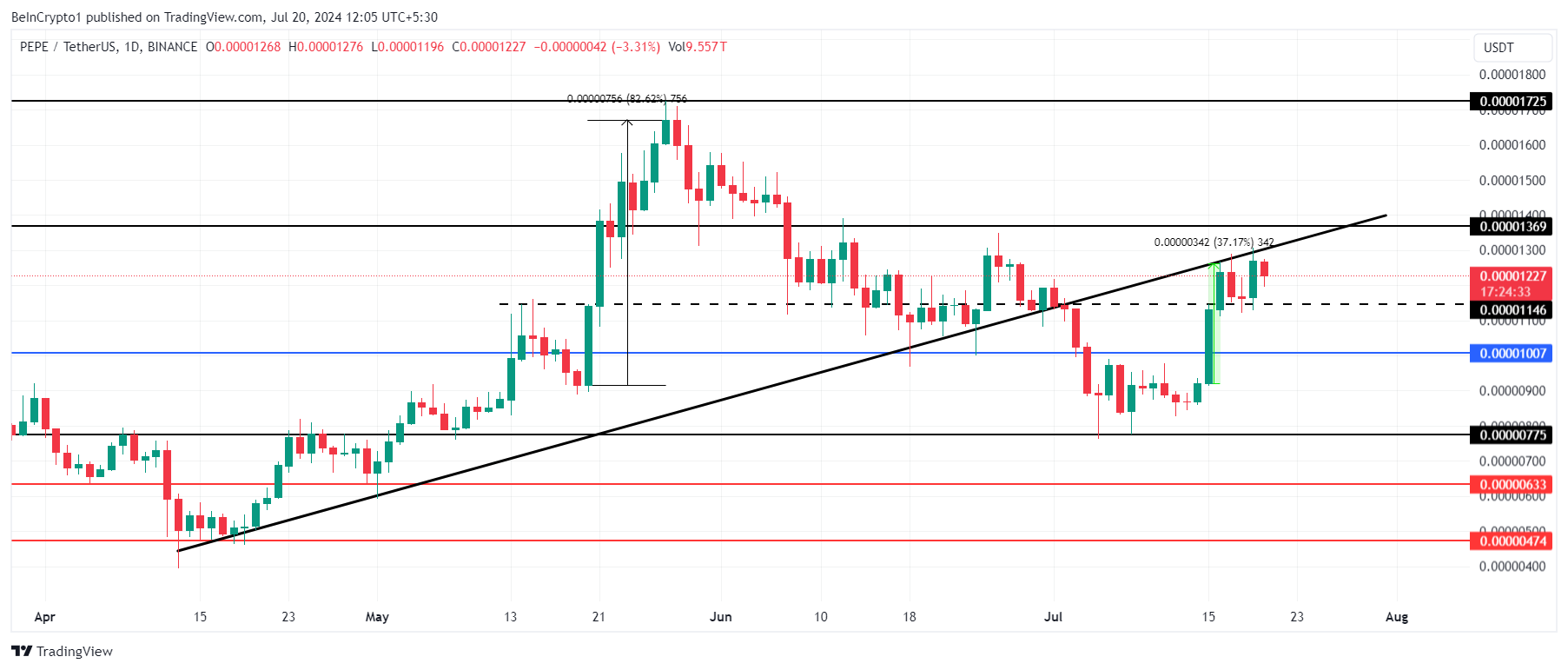 PEPE, đang giao dịch ở mức 0.00001227 USD tại thời điểm viết bài. Giá đang cố gắng lật ngược đường xu hướng tăng ba tháng trở lại thành xu hướng tăng. Sự sụt giảm vào đầu tháng 7 đã khiến meme coin này mất đi sự hỗ trợ này.