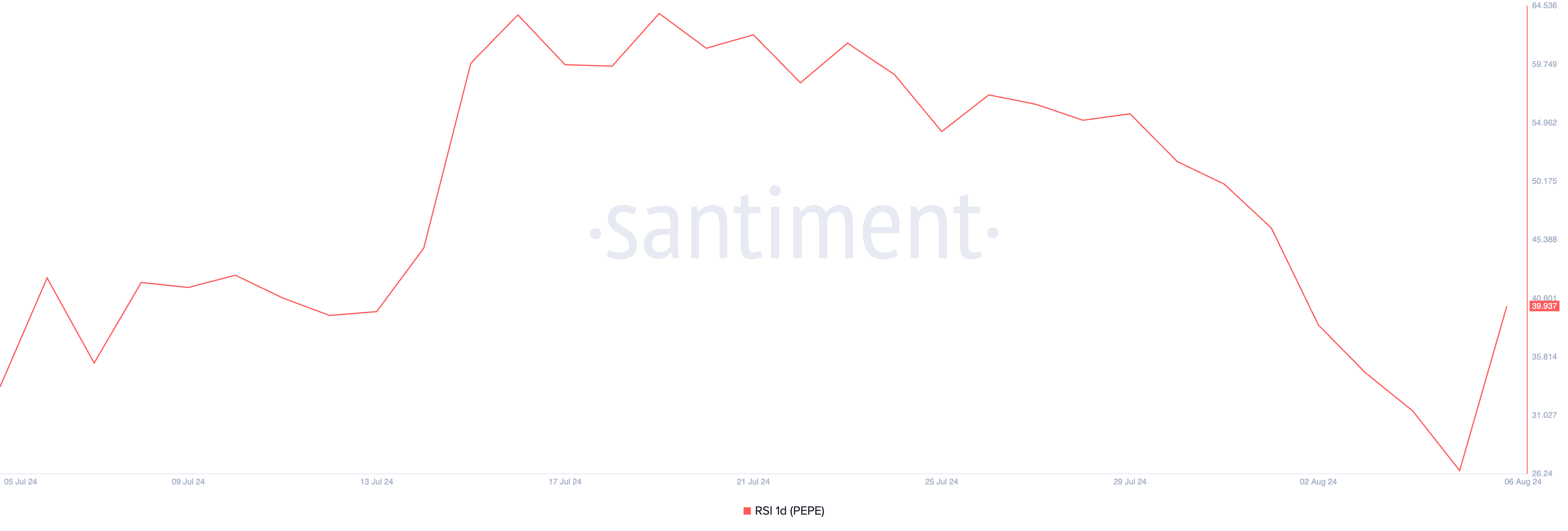 Điều này càng trở nên tồi tệ hơn do thực tế là đợt tăng giá trong khoảng thời gian đó không được hỗ trợ bởi bất kỳ nhu cầu đáng kể nào đối với meme coin. Tại thời điểm viết bài, Chỉ số sức mạnh tương đối (RSI) của PEPE dưới mức trung tính 50 tại 39.93.