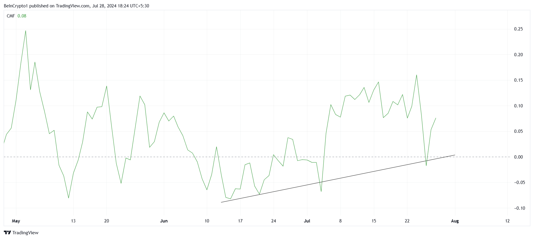 SponsoredMột điểm đáng chú ý trong hoạt động thị trường của Polkadot là dòng vốn đầu tư (CMF) ổn định. Kể từ giữa tháng 6, những dòng vốn này đã có xu hướng tăng liên tục, cho thấy sự quan tâm và niềm tin ngày càng tăng vào dự án.