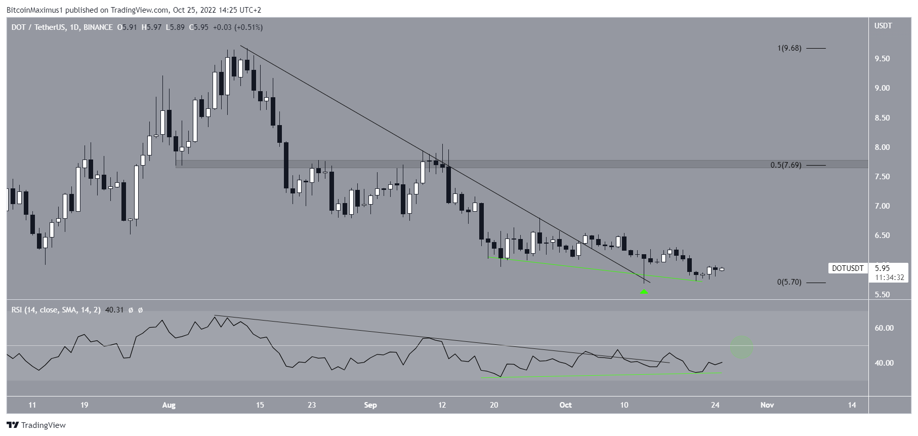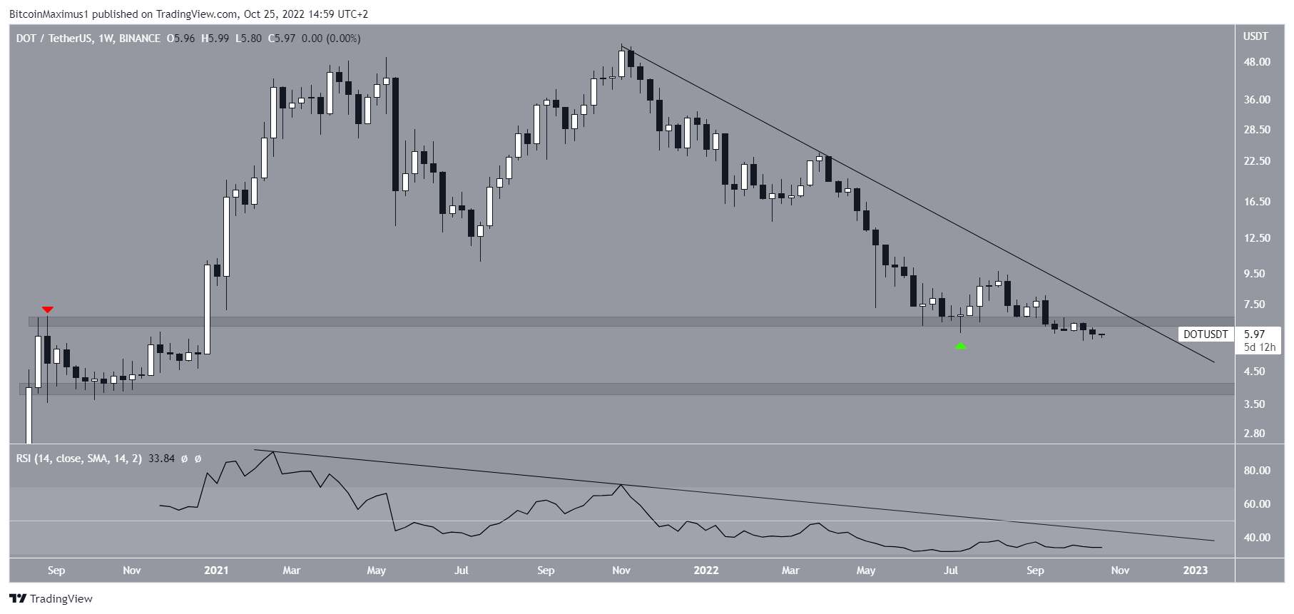Cho đến nay, giá DOT đã đạt mức thấp nhất là 5.68 USD vào ngày 13/10. Mức thấp này rất quan trọng vì nó xác nhận sự cố từ vùng 6.60 USD theo chiều ngang. Khu vực này trước đây đã hoạt động như một ngưỡng kháng cự vào tháng 8/2020 (biểu tượng màu đỏ) trước khi chuyển sang hỗ trợ vào tháng 7/2022 (biểu tượng màu xanh lá cây). Bây giờ khu vực này dự kiến sẽ hoạt động như một ngưỡng kháng cự giá một lần nữa. Nó cũng trùng với đường kháng cự giảm dần nói trên.