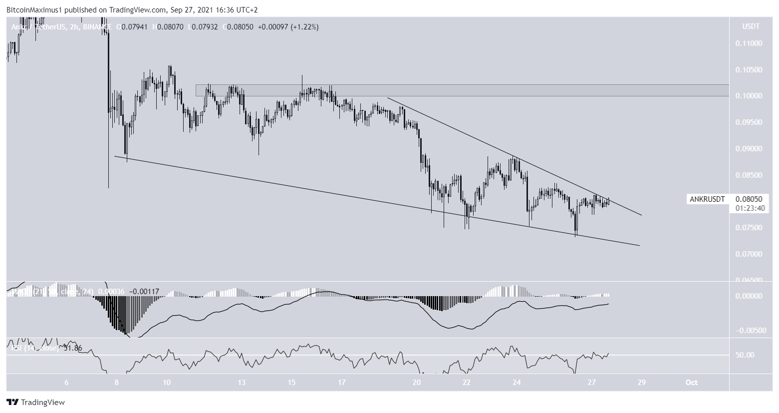 Biểu đồ hai giờ cho thấy ANKR đang giao dịch bên trong một nêm giảm dần. Mô hình nêm được coi là một mô hình đảo chiều tăng giá.