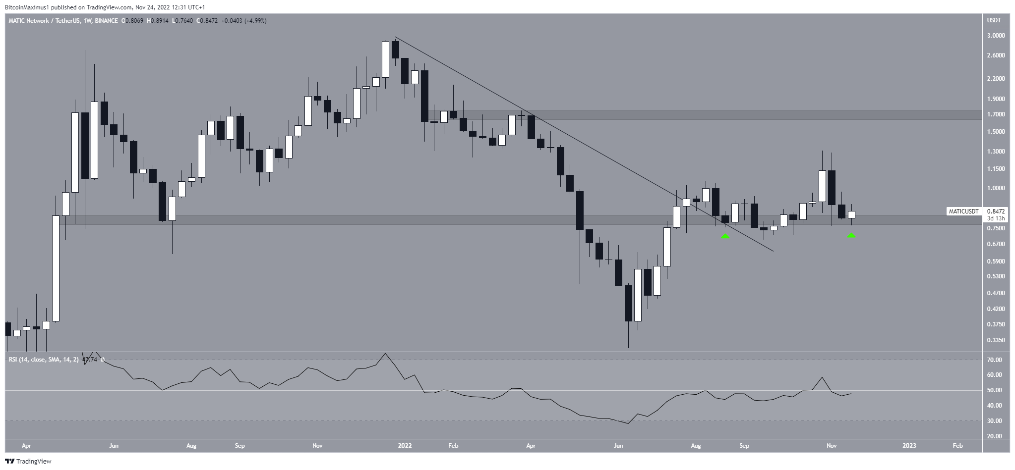 Kể từ đó, giá Polygon đã tăng lên. Vào tháng 7, nó đã thoát ra khỏi đường kháng cự giảm dần và khu vực hỗ trợ ngang 0.8 USD được thiết lập từ tháng 4/2021. Khu vực đó hiện tại đóng vai trò như một mức hỗ trợ cho giá Polygon (biểu tượng màu xanh lá cây). Vùng kháng cự gần nhất là 1.7 USD.