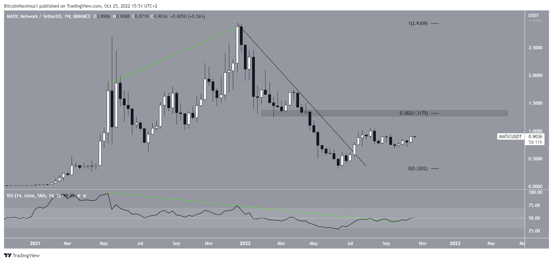 Trong khi giá Polygon đang giảm, có một dấu hiệu tăng mạnh mẽ được đưa ra bởi RSI hàng tuần. Chỉ báo đã thoát ra khỏi đường xu hướng phân kỳ giảm (màu xanh lá cây) và hiện đang trong quá trình di chuyển trên mức 50. Kết hợp với sự bứt phá khỏi đường kháng cự giảm dần trong dài hạn, chuyển động RSI này xác nhận sự đảo chiều tăng giá.
