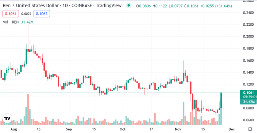 Tin đồn rằng Binance đang tìm cách mua lại giao thức đa chuỗi Ren đã khiến giá REN tăng vọt 32% lên 0.1061 USD.