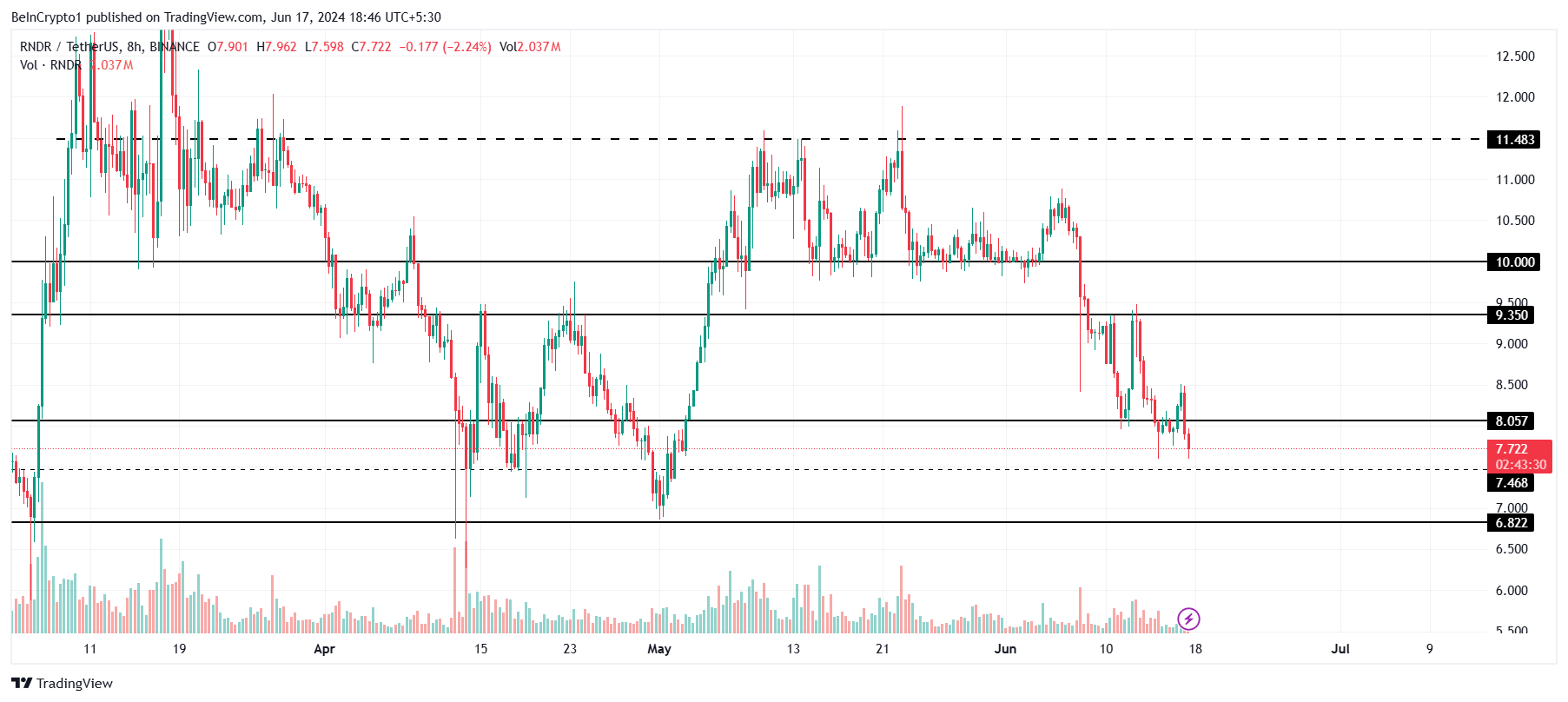 Giá của Render, đang giao dịch ở mức 7.72 USD, đã giảm xuống dưới mức hỗ trợ 8.05 USD. Những dấu hiệu giảm giá đã nêu trên cho thấy Altcoin này có thể giảm xuống để thử mức hỗ trợ tại 7.46 USD. Nếu áp lực bán tăng lên, RNDR có thể giảm xuống còn 6.82 USD để đánh dấu mức thấp nhất trong một tháng rưỡi.