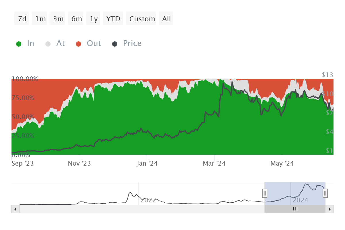 Sự sụt giảm giá của Render đã dẫn đến việc bán ra ồ ạt của các nhà đầu tư do mất lợi nhuận trong những ngày qua. Phân bổ lợi nhuận/thua lỗ tổng thể của token bản địa RNDR cho thấy số lượng nhà đầu tư có lợi nhuận đã đạt mức thấp nhất trong 8 tháng. Sự suy giảm này đánh dấu lần đầu tiên kể từ tháng 10/2023 chỉ có 60% nhà đầu tư có lợi nhuận. Điều này làm nổi bật sự suy giảm đáng kể về tâm lý thị trường và lợi nhuận cho các chủ sở hữu RNDR.
