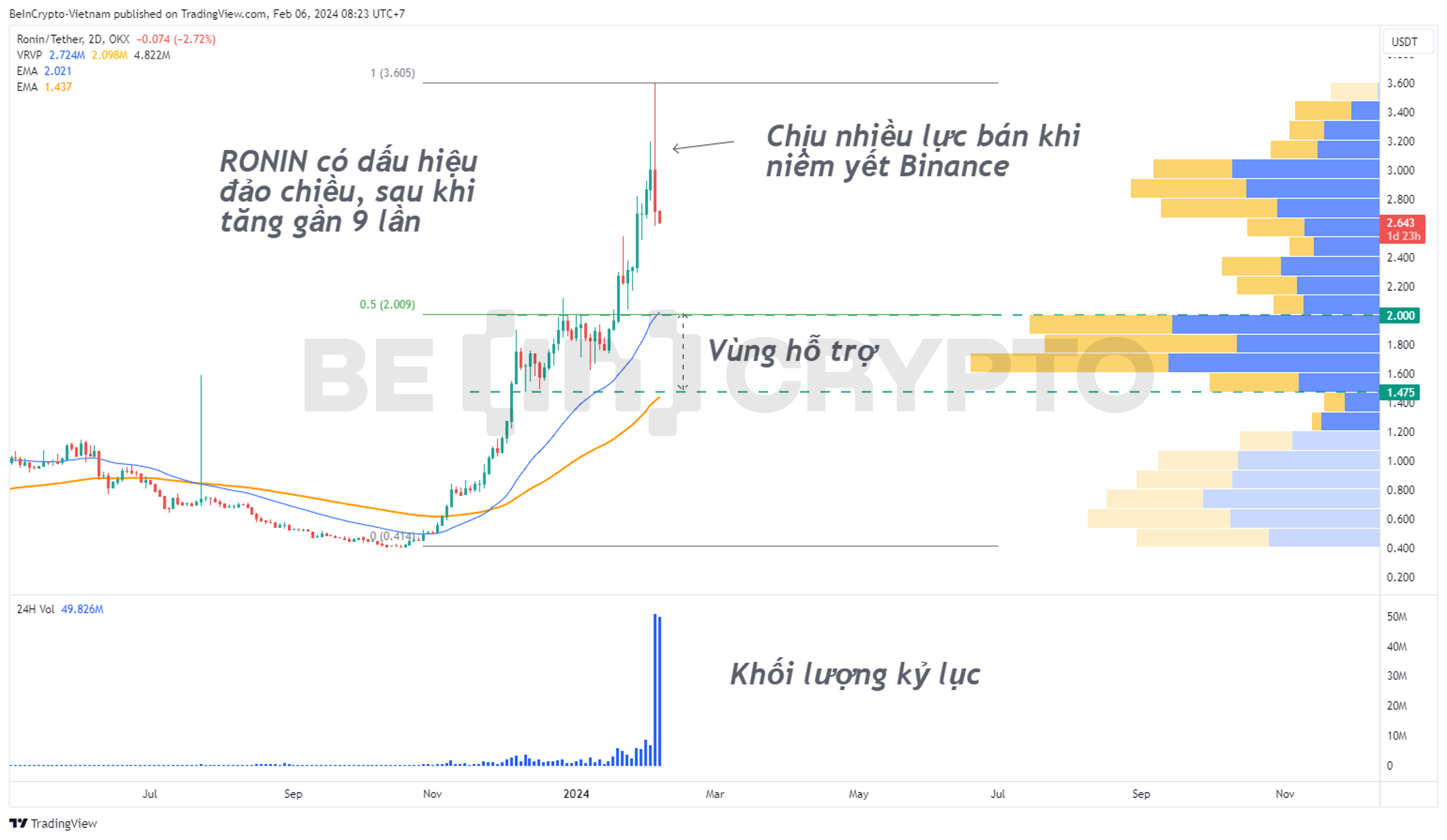 Tính cả quý cuối năm 2023 cho đến nay, giá Ronin (RON) đã tăng gần 9 lần, từ 0.4 USD của tháng 11/2023 đến 3.6 USD của tháng 2/2024. Tuy nhiên, khối lượng giao dịch thúc đẩy đà tăng này rất thấp, trung bình trong biên độ 10 triệu USD – 20 triệu USD.