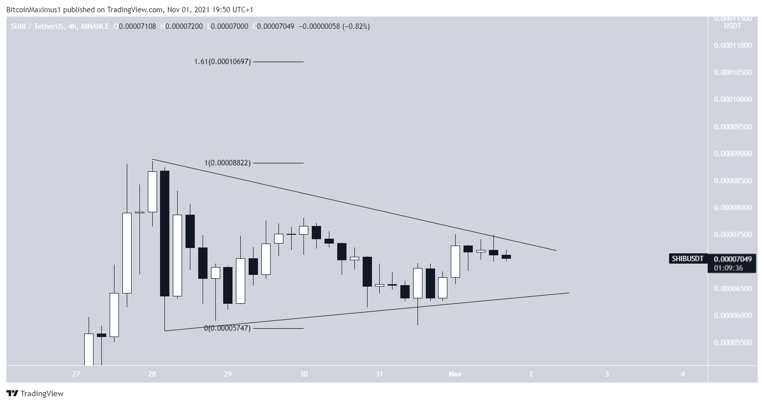 Biểu đồ 4 giờ cho thấy giá SHIB đang giao dịch bên trong một mô hình tam giác đối xứng. Mô hình tam giác được coi là một mô hình trung lập, và nó được hình thành sau một chuyển động đi lên. Do đó, một sự đột phá sẽ có nhiều khả năng xảy ra hơn, vì nó chỉ đơn giản là tiếp tục xu hướng đang diễn ra.