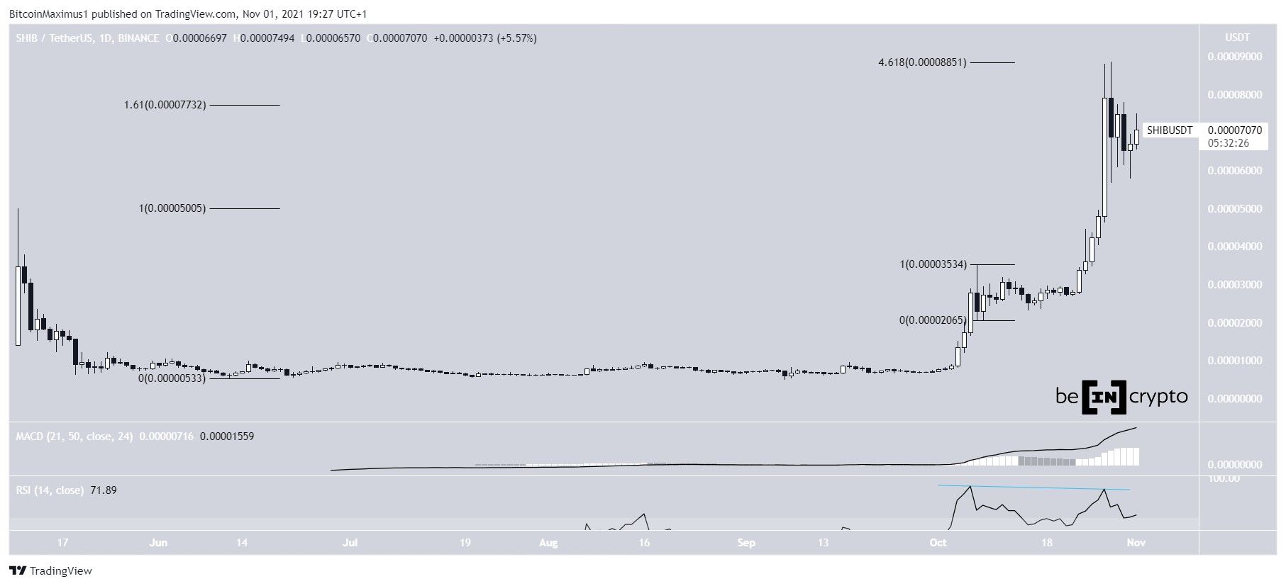 Giá SHIB đã tăng lên với tốc độ chóng mặt kể từ ngày 23 tháng 10. Đà tăng kéo dài trong năm ngày đưa giá SHIB đạt mức đỉnh mới tại 0.000088 USD.