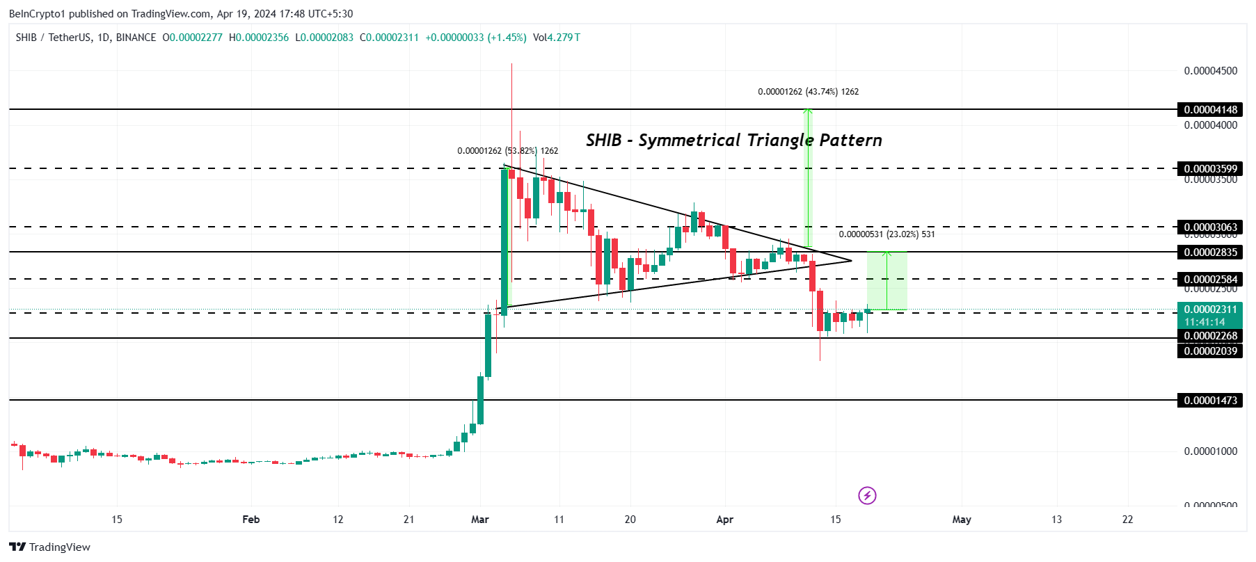 Giá của Shiba Inu, giao dịch ở mức 0.00002311 USD tại thời điểm BeInCrypto viết bài, sắp bắt đầu một đợt tăng giá, dự kiến sẽ đẩy đồng meme lên 0.00002835 USD. SHIB có thể tăng 23% với các tín hiệu thị trường rộng lớn hơn tăng giá, miễn là nó có thể biến ngưỡng kháng cự 0.00002584 USD thành hỗ trợ. Điều này cũng sẽ cho phép meme coin một lần nữa cố gắng đạt được mục tiêu tăng 43% của mô hình tam giác đối xứng.