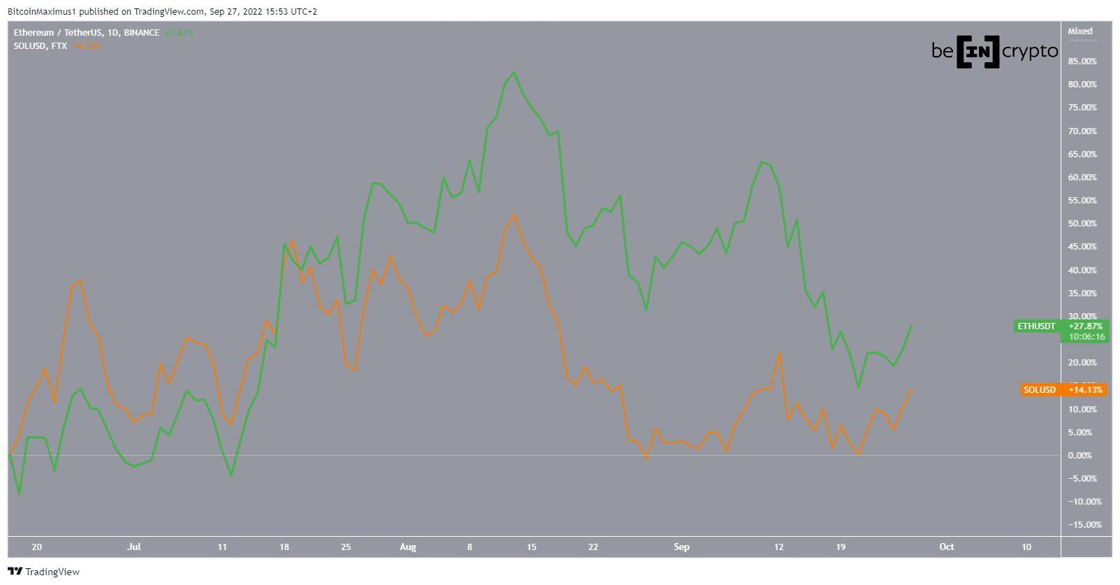 Bất chấp hiệu suất này, giá của SOL vẫn bị tụt lại so với ETH, cả dựa trên tốc độ tăng và giá thực tế của nó. Khi so sánh mức tăng của SOL (màu cam) và ETH (màu xanh lá cây) kể từ mức thấp nhất trong tháng 6, mức tăng của SOL là 14% trong khi của ETH là 28%. Do đó, mặc dù mạng Solana có hiệu suất tương đối tốt hơn về số lượng giao dịch, giá của nó vẫn thấp hơn ETH.