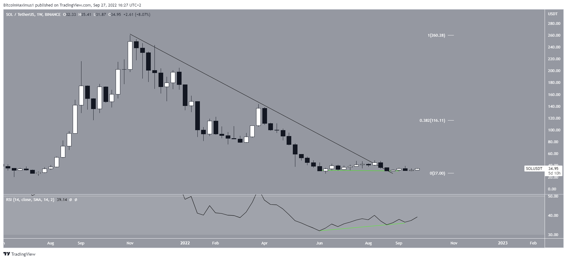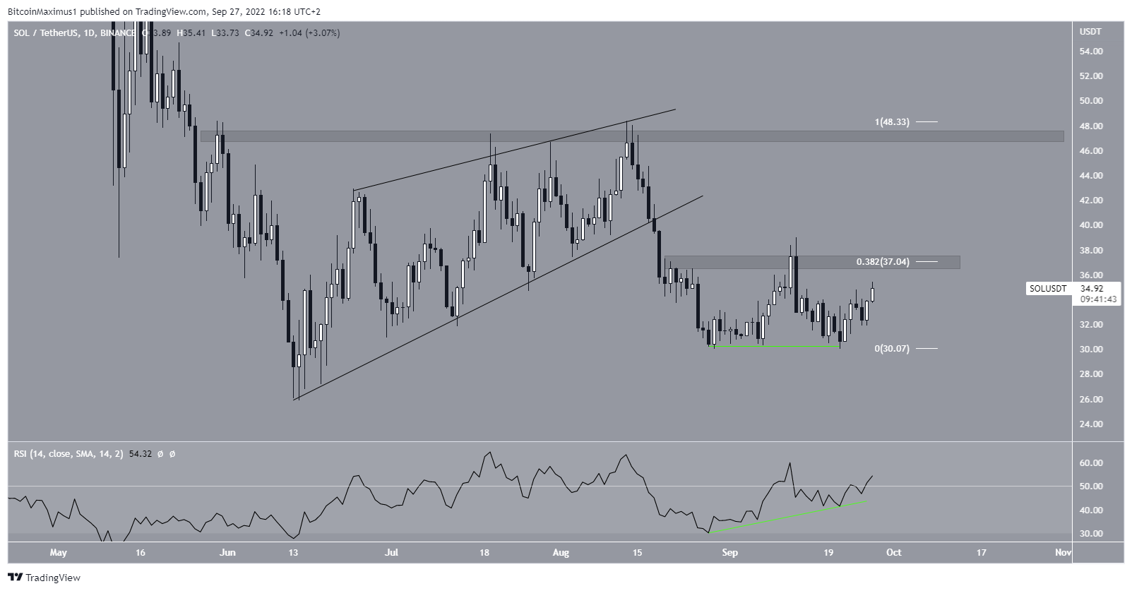 SOL đã giảm kể từ khi phá vỡ từ một nêm tăng dần vào ngày 18/8. Tuy nhiên, nó đã lấy lại vị thế của mình trong 5 ngày qua và đã tăng 16% dẫn đến mức cao là 35.12 USD. Sự gia tăng diễn ra sau khi giá tạo ra mô hình hai đáy, được kết hợp với sự phân kỳ tăng (đường màu xanh lá cây) trong chỉ báo RSI hàng ngày. Các mô hình như vậy thường dẫn đến các chuyển động đi lên.
