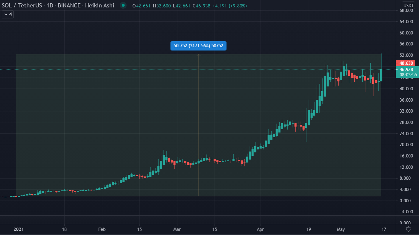 Dự án này đã lọt vào top 15 về vốn hóa thị trường. Với tổng vốn hóa thị trường là 13,6 tỷ đô la. Sự tăng trưởng quả là không tồi khi mà đầu năm giá của nó chỉ khoảng $1,51 đô la. Mức đỉnh mới được thiết lập của SOL đã đánh dấu mức tăng 3.100% từ đầu năm 2021 tới nay.