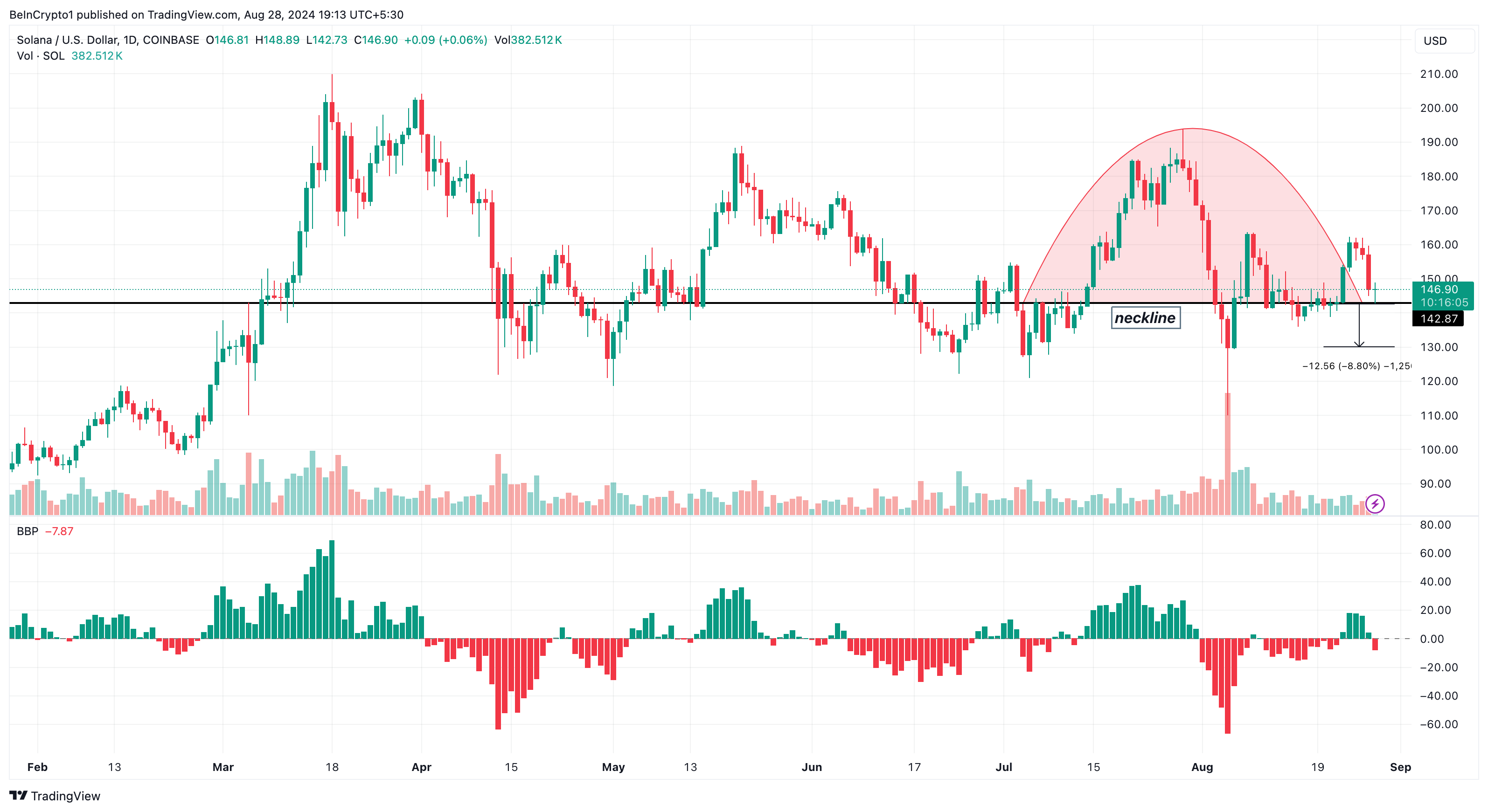 Vào ngày 25/08, Solana (SOL) đã xuất hiện một nến đỏ trên biểu đồ khung ngày, tiếp theo là một nến đỏ nữa vào ngày hôm sau. Hiện tại, phe mua đang cố gắng đẩy giá lên mức 150 USD. Tuy nhiên, sự hình thành một đỉnh tròn trong giai đoạn này cho thấy việc đạt được mức giá như vậy có thể khó khăn trong ngắn hạn.