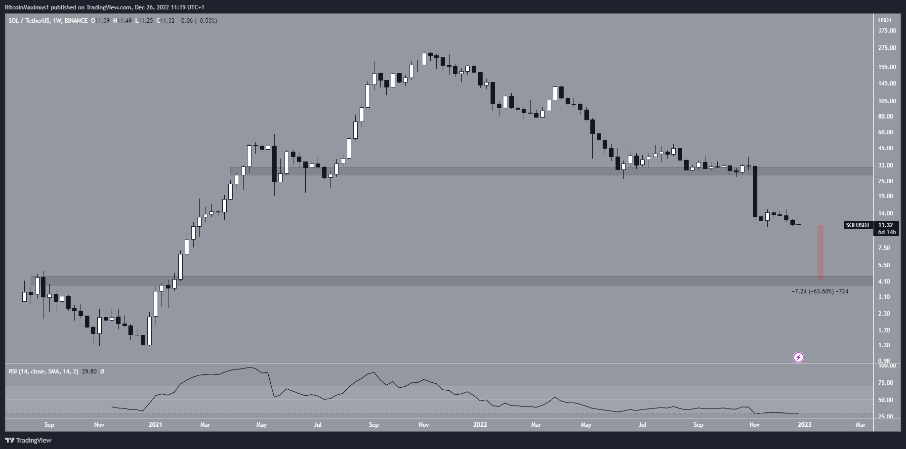 Giá Solana đã giảm kể từ mức ATH là 259.90 USD vào tháng 11/2021. Từ tháng 5 đến tháng 11/2022, giá SOL bật lên ở vùng hỗ trợ ngang 29 USD. Tuy nhiên, giá đã phá xuống vào ngày 14/11 và hình thành một cây nến nhấn chìm giảm lớn. Giá SOL đạt mức thấp nhất là 10.94 USD vào cuối tháng trước.