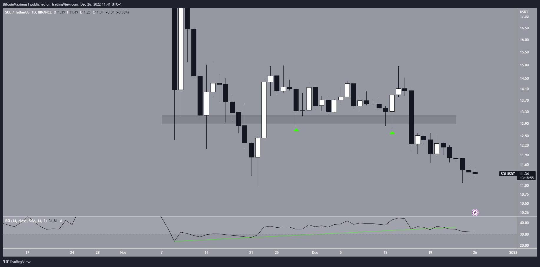 Các phân tích từ khung thời gian ngày cũng tương tự như khung tuần. Đầu tiên, giá Solana đã phá vỡ từ khu vực ngang 13 USD. Điều này xảy ra sau hai lần xác thực khu vực này là hỗ trợ (biểu tượng màu xanh lá cây).