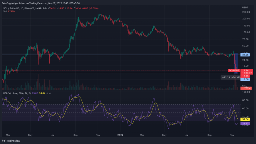 Mặc dù SOL đã đi theo một đường xu hướng giảm lớn, nhưng các nhà phân tích dự kiến giá vẫn sẽ giảm hơn nữa. Sự cố FTX gần đây đã khiến giá SOL giảm xuống mức đáy của tháng 3/2021. Việc bán tháo token hàng loạt đang tiếp tục diễn ra trên thị trường. Theo đó, khối lượng giao dịch Solana ghi nhận mức tăng đột biến cùng với giá giảm. Sau sự cố FTX, SOL đã mất hơn 63% giá trị chỉ trong vài ngày.