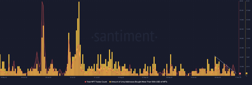 Số lượng địa chỉ duy nhất mang lại hơn 100,000 USD doanh thu NFT trên Solana ghi nhận sự sụt giảm đáng kể từ ngày 03/11. Tổng số giao dịch NFT cũng không có hoạt động lớn nào trên các Solana NFT marketplace.