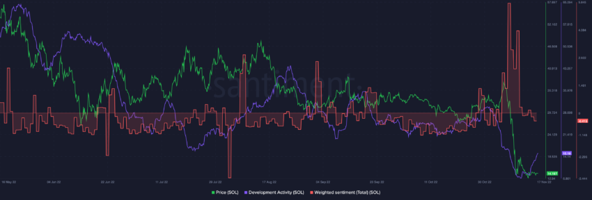 Solana thường được mô tả là “kẻ huỷ diệt Ethereum”, nhưng dường như SOL không có hoạt động phát triển cũng như mức tâm lý tích cực để có thể cho phép nó tiến gần hơn đến Ethereum. Hoạt động phát triển mạng trên Solana đã giảm xuống mức thấp nhất mọi thời đại vào ngày 11/11.