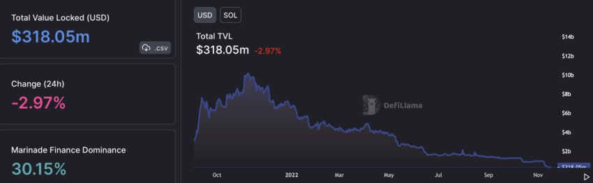 Sau sự sụp đổ của FTX, hệ sinh thái Solana DeFi đã bị ảnh hưởng. Tổng giá trị bị khóa (TVL) trong DeFi trên Solana đã giảm hơn 96% kể từ mức cao nhất là 10 tỷ USD. Dữ liệu BeInCrypto ghi nhận từ DeFiLlama cho thấy rằng chỉ có 318.05 triệu USD tài sản thế chấp trong DeFi trên Solana.