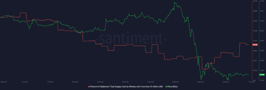 Trong khi mọi thứ dường như đều đang gặp khó khăn, một xu hướng tích cực đối với những nhà đầu tư Solana là tỷ lệ phần trăm tổng nguồn cung stablecoin do cá voi nắm giữ với hơn 5 triệu USD đã tăng vọt.