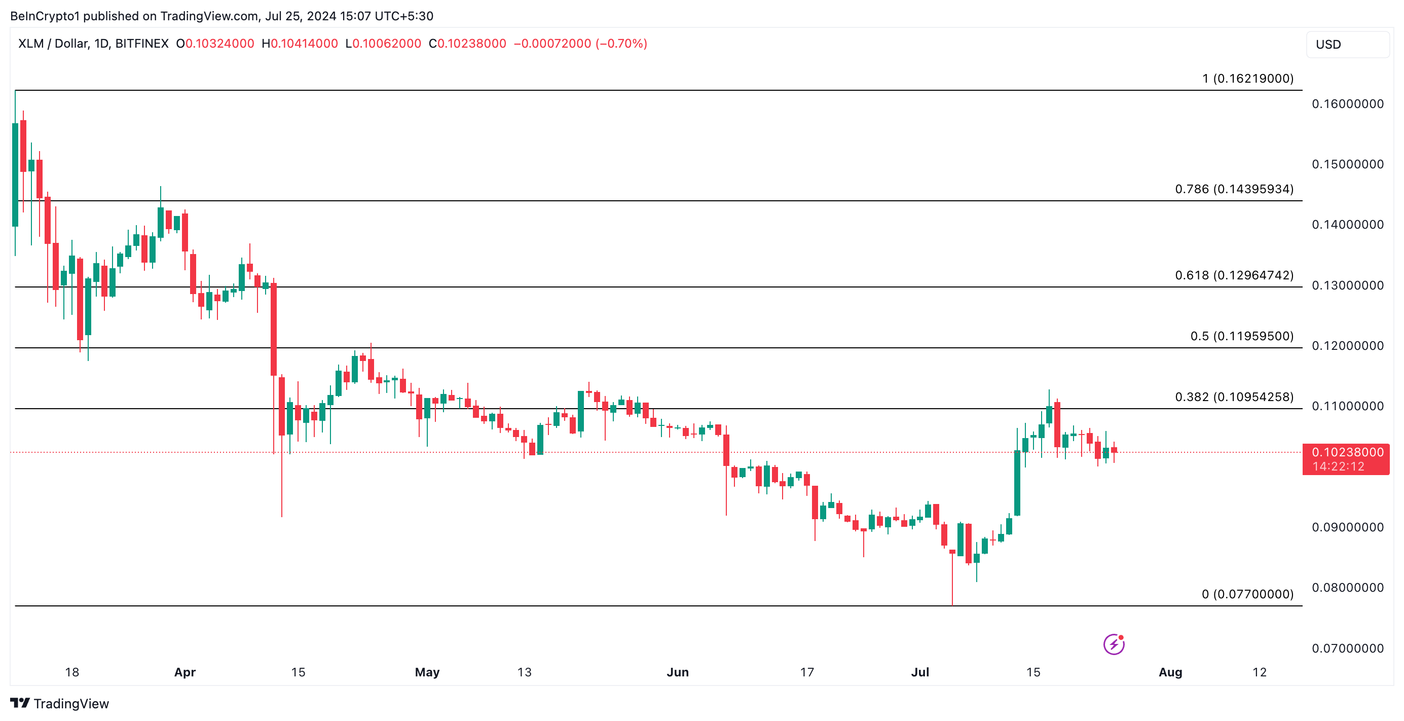 Nếu xu hướng này tiếp tục và áp lực bán vượt trội so với việc tích lũy token, giá của XLM có thể giảm xuống 0.077 USD. Lần cuối cùng đồng tiền điện tử này được giao dịch ở mức thấp như vậy là vào tháng 06/2023.