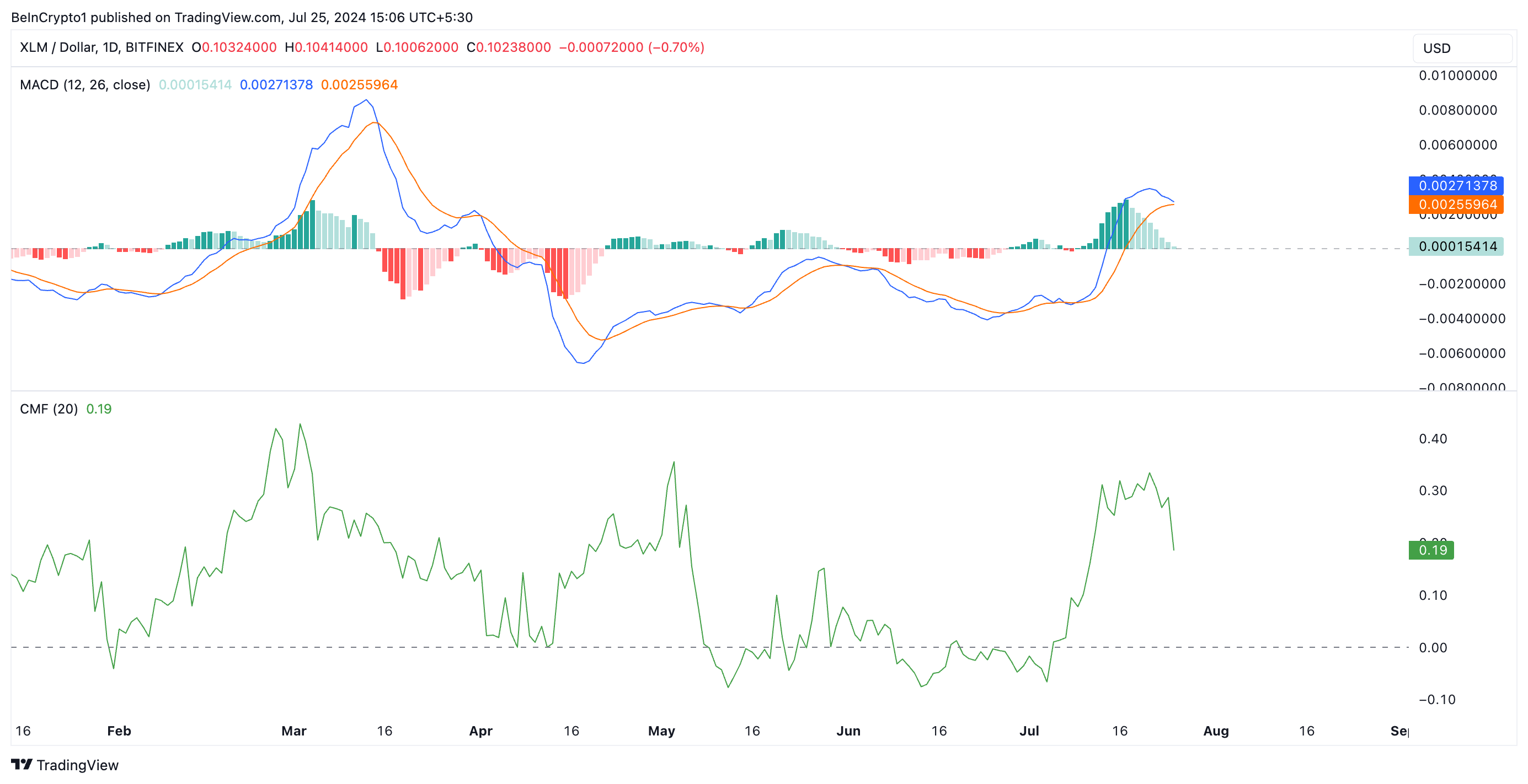 Tại thời điểm viết bài, XLM được giao dịch ở mức 0.10 USD. Chịu ảnh hưởng từ đợt tăng giá của thị trường rộng lớn trong tháng trước và sự gia tăng nhu cầu đối với tài sản này, giá trị của XLM đã tăng gấp đôi trong 30 ngày qua. Tuy nhiên, theo một số chỉ báo kỹ thuật chính của token, khi hoạt động chốt lời gia tăng, tâm lý thị trường đang chuyển từ lạc quan sang bi quan.