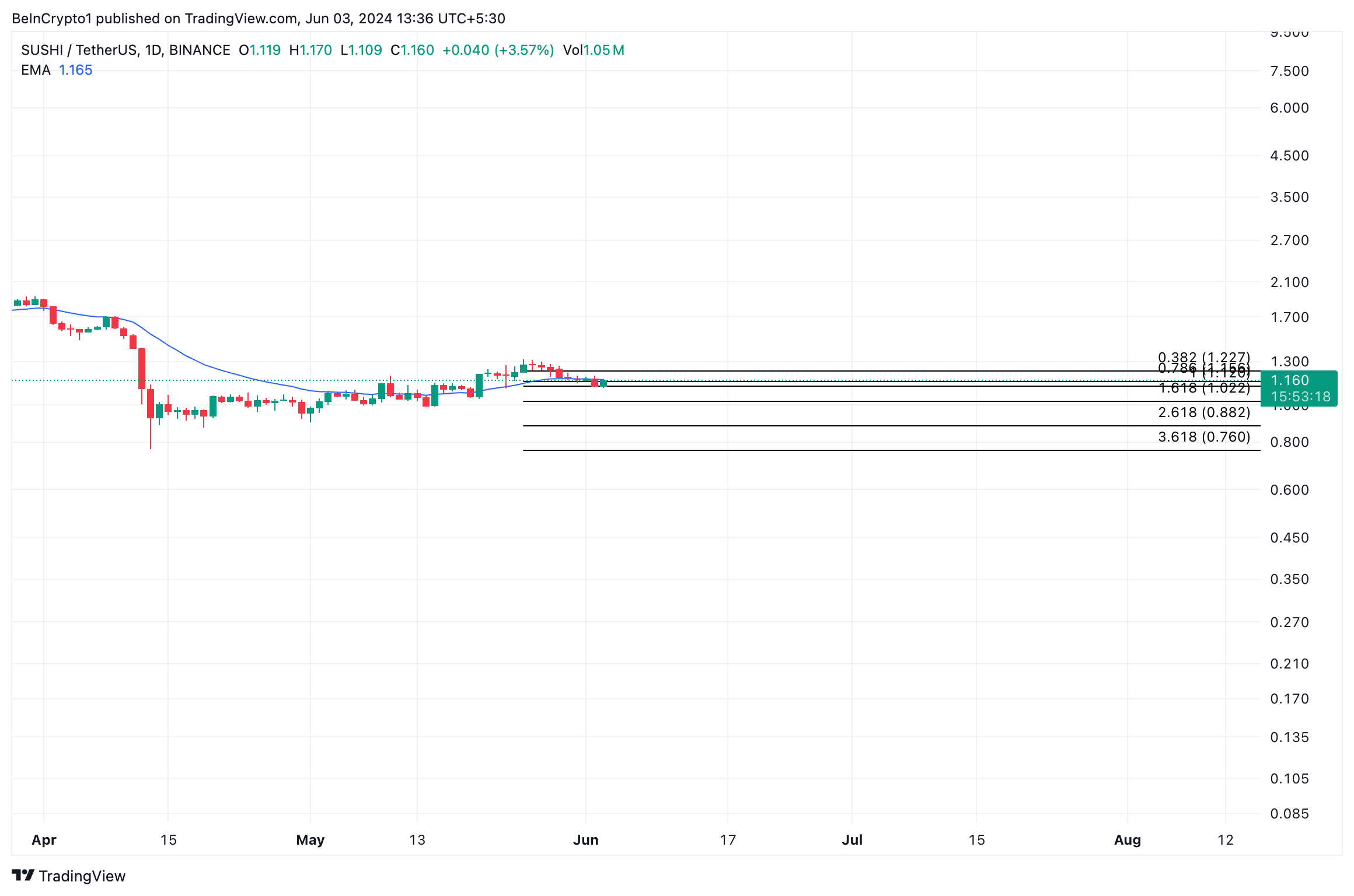 Nếu xu hướng bán này tiếp tục, SUSHI có thể mất mức tăng gần đây nhất và giảm xuống dưới 1 USD để tiệm cận mức 0.88 USD.