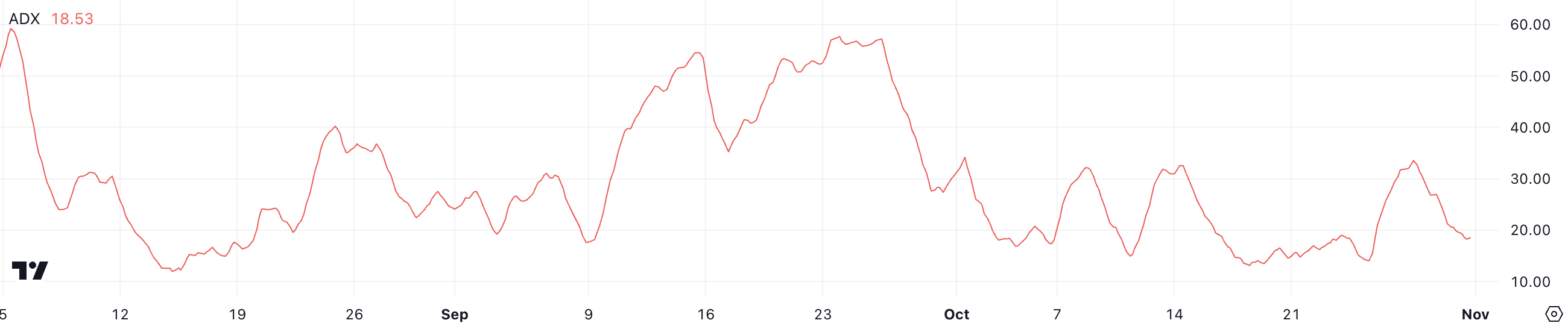 Chỉ số ADX của TAO đã giảm xuống 18.53 từ gần 35 chỉ vài ngày trước, cho thấy sự giảm đáng kể trong sức mạnh xu hướng. Sự sụt giảm này cho thấy động lực điều chỉnh gần đây đang yếu đi, có thể dẫn đến sự giảm biến động trong ngắn hạn.