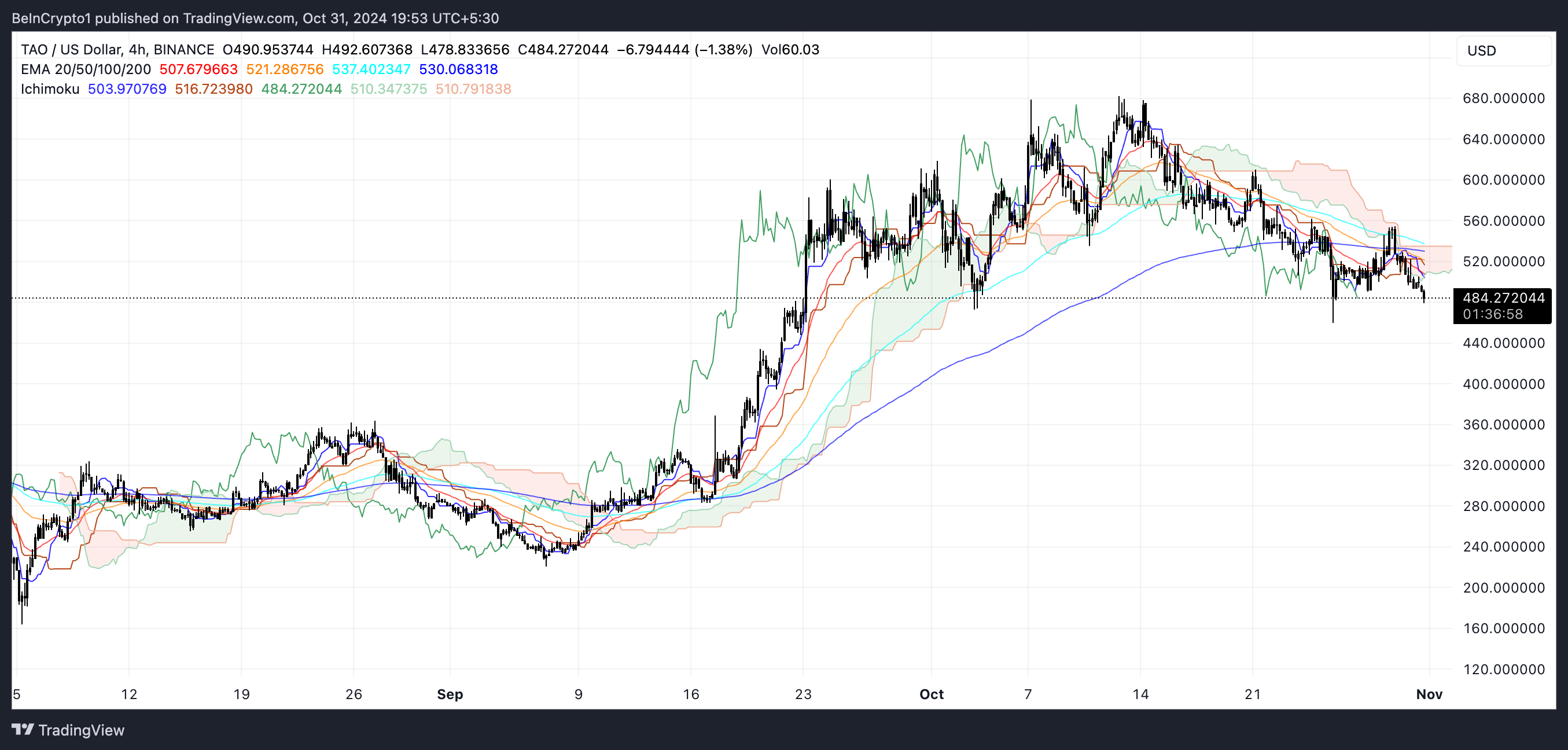 Đám mây Ichimoku của TAO cho thấy xu hướng giảm