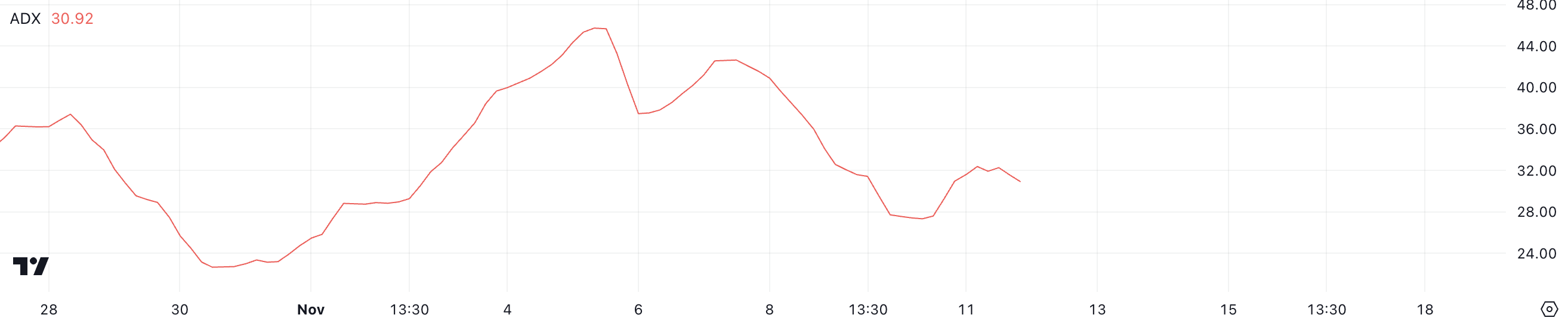 SponsoredMột giá trị ADX trên 25 cho thấy xu hướng mạnh, trong khi các giá trị dưới 20 cho thấy thị trường yếu hoặc dao động. Giá trị ADX hiện tại của TAO cho thấy mức độ chuyển động hướng rõ ràng trên thị trường. Đồng tiền này tăng 36.85% trong bảy ngày qua, khẳng định nó là đồng tiền AI lớn nhất trên thị trường.