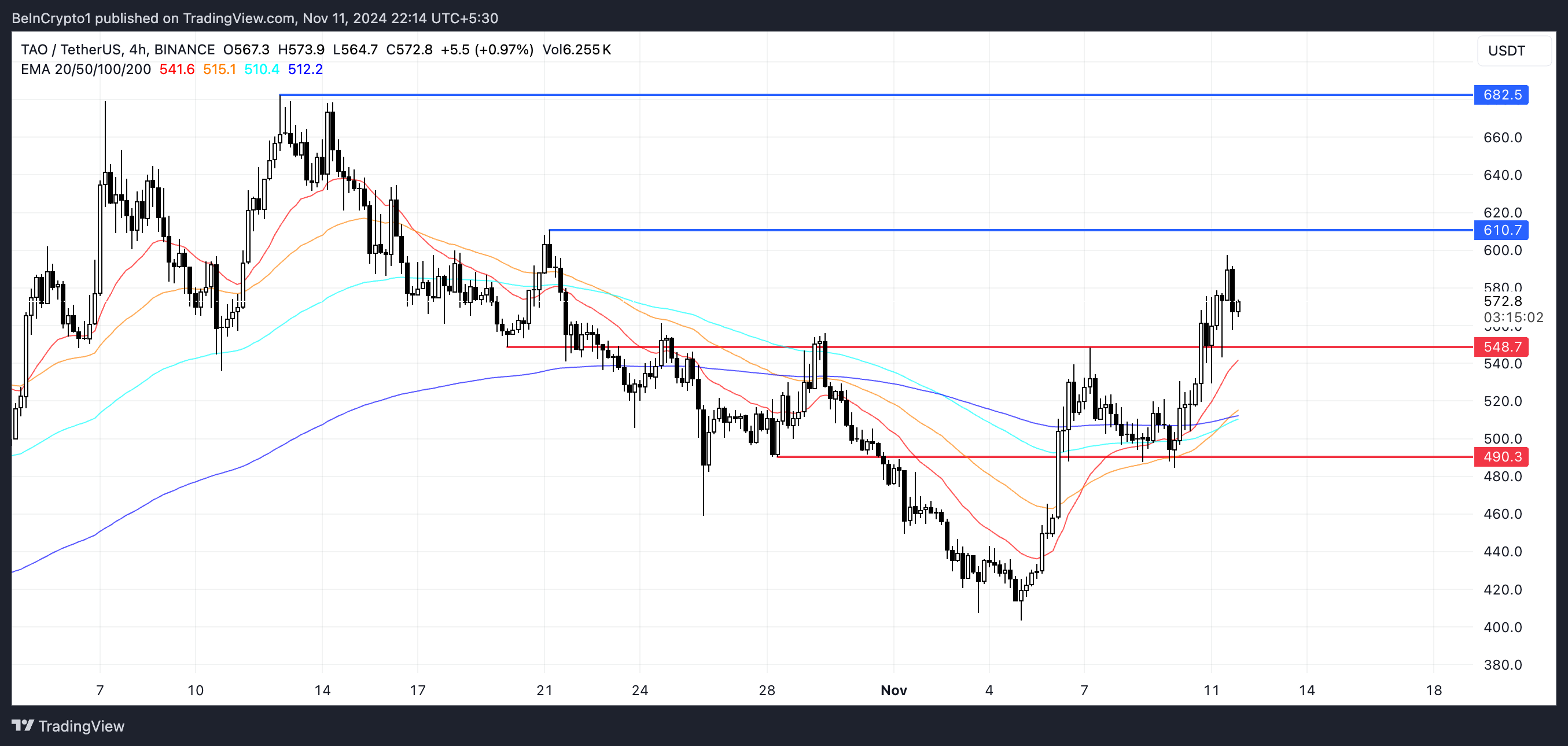 Kháng cự mạnh gần nhất của TAO hiện tại là khoảng 610 USD. Nếu giá có thể vượt qua mức này, nó có thể kích hoạt thêm động lực mua, có thể đẩy giá TAO lên đến 682 USD, tương đương với mức tăng 19.2% khi các đồng tiền AI tiếp tục thu hút sự chú ý. Tuy nhiên, nếu đà tăng hiện tại suy yếu, một đợt điều chỉnh có thể sắp xảy ra.