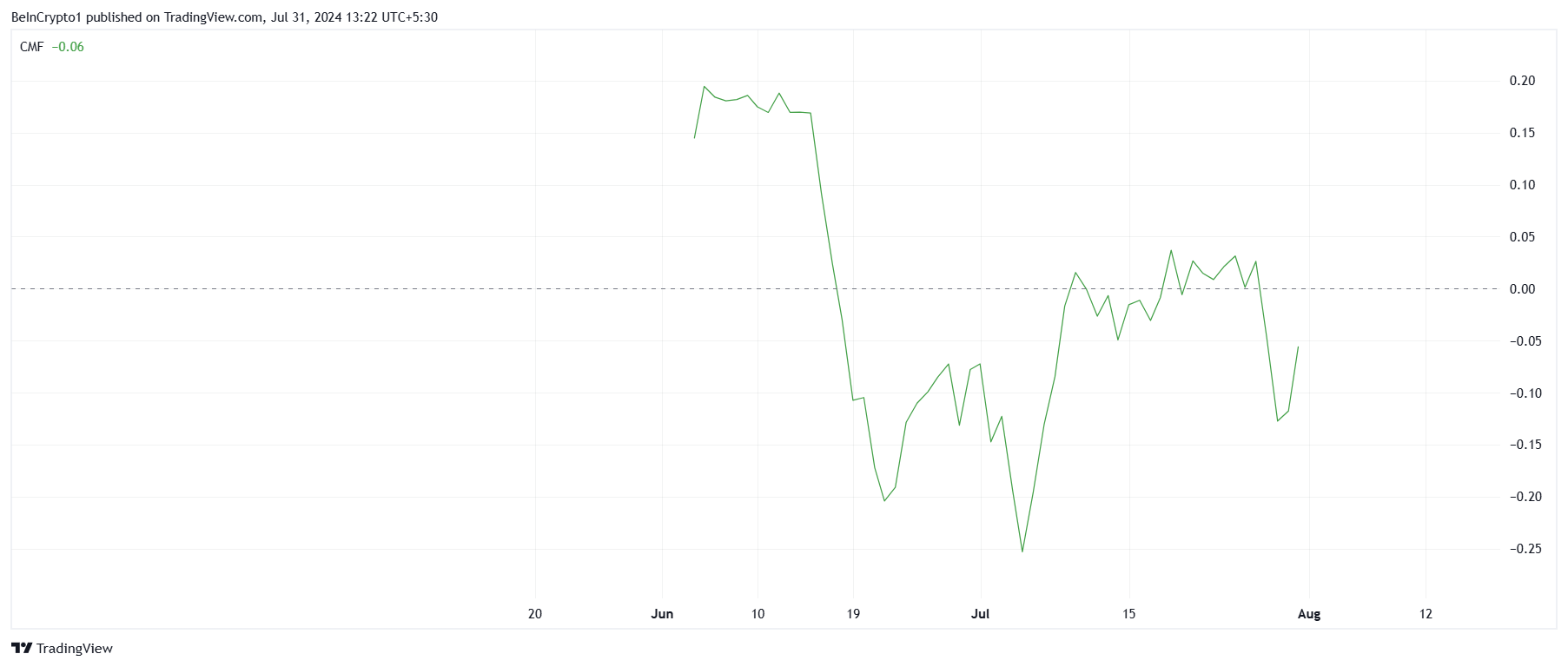 Ngoài ra, dòng tiền của đồng Telegram theo chỉ số Chaikin Money Flow (CMF) cũng cho thấy dòng tiền ra mạnh. Chỉ số kỹ thuật này, đo lường khối lượng dòng tiền trong một khoảng thời gian nhất định, cho thấy có nhiều tiền rời khỏi Notcoin hơn là vào.
