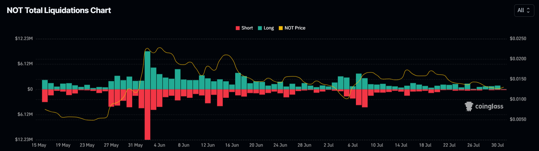 Sự giảm giá liên tục của Notcoin cuối cùng sẽ ảnh hưởng đến các nhà đầu tư lạc quan. Trong hai tuần qua, các nhà giao dịch dài hạn đã phải đối mặt với hầu hết các đợt thanh lý. Những đợt thanh lý liên tục cho thấy sự thiếu tự tin ngày càng tăng của các nhà đầu tư lạc quan. Khi những nhà đầu tư này rời bỏ vị thế của mình, thị trường có thể trải qua sự biến động tăng cao.