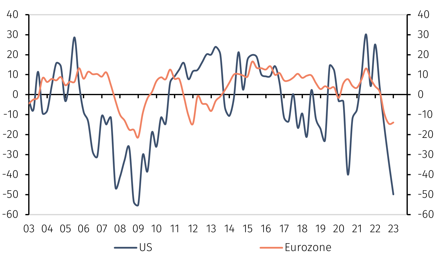 - Nhu cầu vay vốn của khu vực doanh nghiệp và tư nhân đã ghi nhận đà giảm mạnh đầu năm 2023. Biểu đồ cho thấy mức giảm này tương đương với giai đoạn 2008 – 2010.
