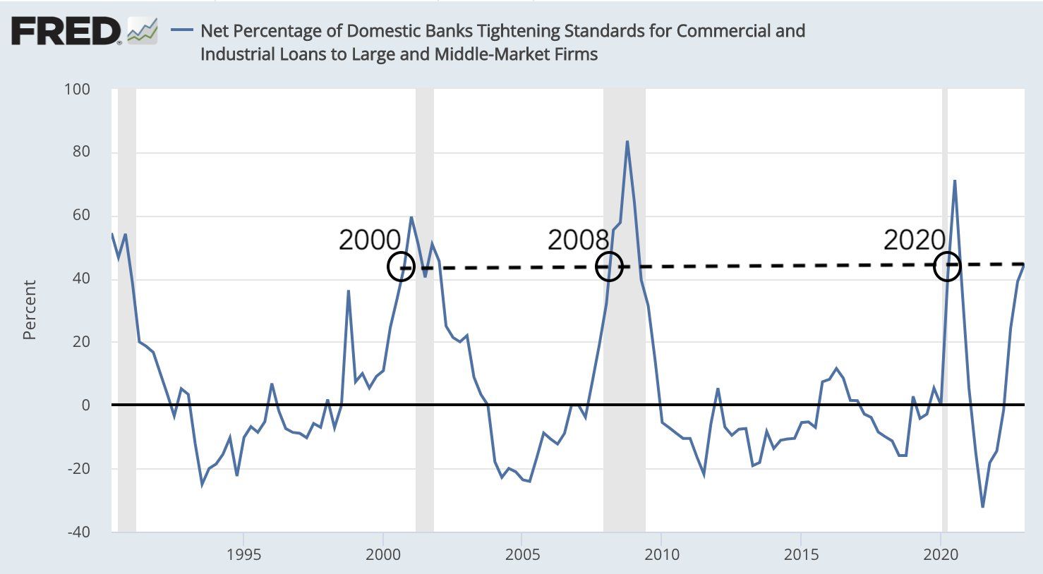 - Tỷ lệ các ngân hàng quyết định siết chặt tín dụng đang ngang bằng với hai giai đoạn suy thoái trong lịch sử (2000 và 2008). Từ đây, các doanh nghiệp lớn muốn phát triển và mở rộng hoạt động kinh doanh sẽ trở nên khó khăn hoặc bất khả thi.