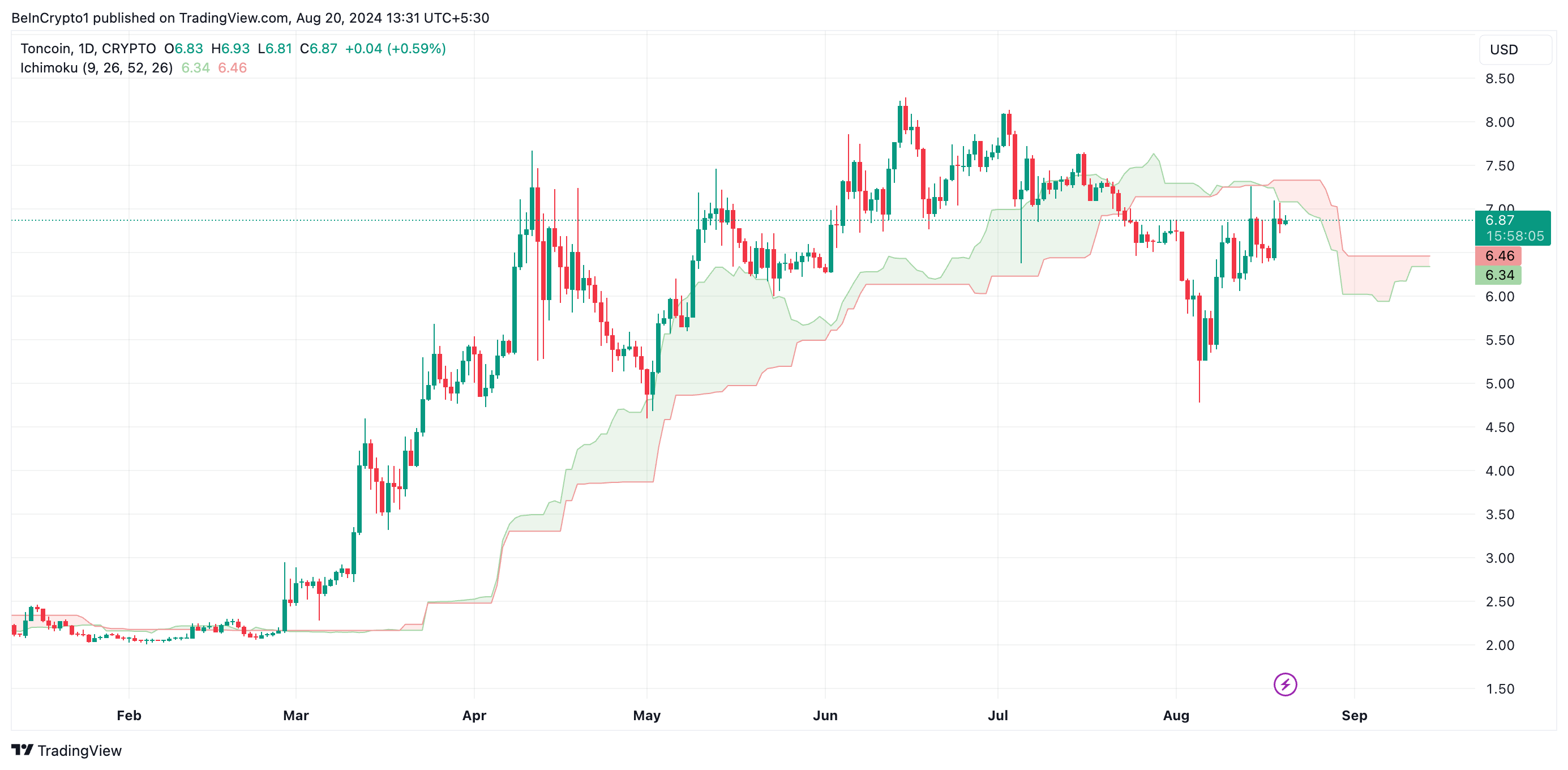 Tại thời điểm viết bài, TON được giao dịch ở mức 6.84 USD. Dữ liệu từ biểu đồ hàng ngày cho thấy sự sụt giảm giá chỉ là tạm thời vì đồng tiền này vẫn có vị thế tốt để tiếp tục xu hướng tăng. Giá TON đang hướng tới mô hình Ichimoku Cloud từ phía dưới. Chỉ báo này xác định hướng đi của xu hướng tài sản, đo lường động lực và xác định các mức hỗ trợ và kháng cự. Tại thời điểm báo chí, giá TON được nhận thấy đang tiếp cận đám mây này theo xu hướng tăng.