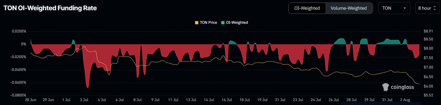 Sự giảm giá của Toncoin dường như đã đẩy các nhà đầu tư đến bờ vực của việc từ bỏ tâm lý lạc quan để chuyển sang bi quan một lần nữa. Điều này được thể hiện qua tỷ lệ tài trợ âm (Funding rate) của TON, cho thấy rằng các nhà đầu tư chủ yếu đang đặt cược vào các vị thế bán khống. Xu hướng này cho thấy nhiều người đang đặt cược vào việc giá tài sản sẽ tiếp tục giảm.