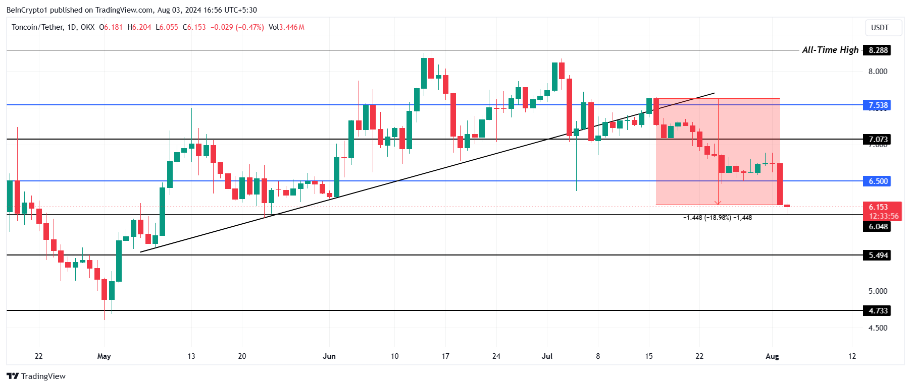 Giá của Toncoin là 6.15 USD tại thời điểm viết bài đang thử nghiệm mức hỗ trợ quan trọng là 6.04 USD. Nếu các yếu tố bi quan kể trên ảnh hưởng nặng nề đến Telegram coin, sự sụt giảm thêm có thể sẽ diễn ra. Điều này có thể dẫn đến việc giá sẽ giảm xuống dưới 6.04 USD, khiến TON đạt mức thấp nhất trong 3 tháng. Sự sụt giảm tiềm năng có thể đưa giá của Toncoin xuống còn 5.49 USD.