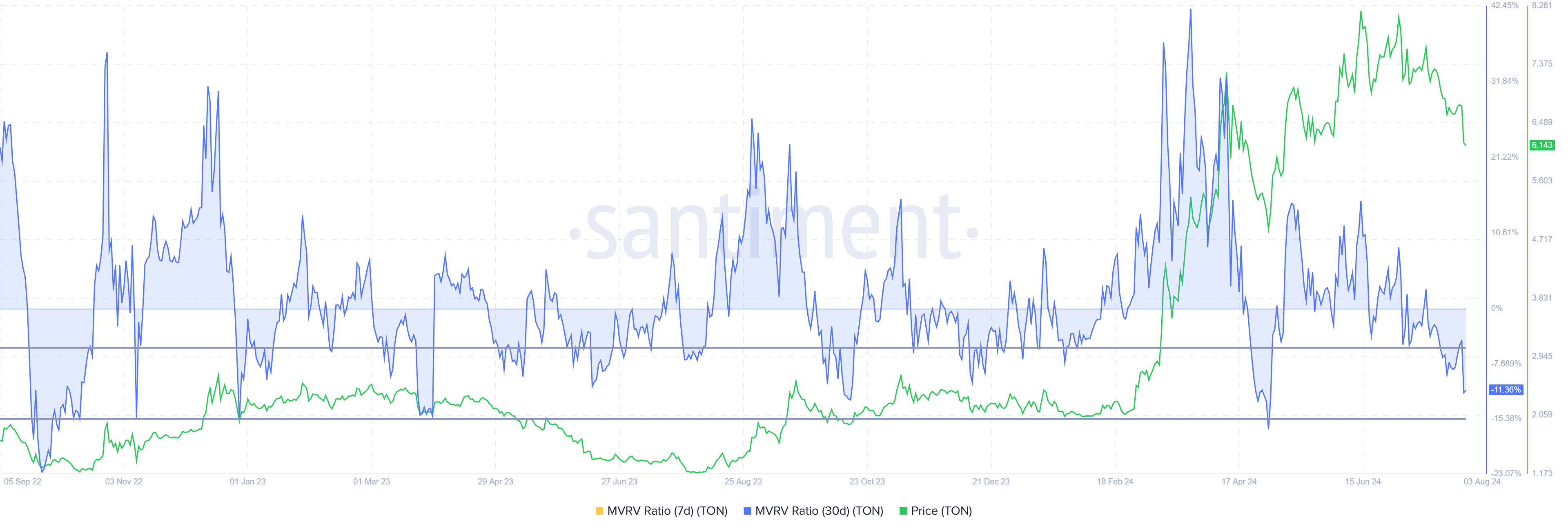 Tỷ lệ MVRV cũng đưa ra cơ hội mua. Tỷ lệ MVRV đánh giá lợi nhuận và thua lỗ của nhà đầu tư. Hiện tại, MVRV 30 ngày của Toncoin đang ở mức -11%, cho thấy thua lỗ và áp lực mua có thể xảy ra. Lịch sử cho thấy, TON thường điều chỉnh khi MVRV nằm trong khoảng từ -5% đến -15%, thường là dấu hiệu bắt đầu cho sự phục hồi và tăng giá, đánh dấu nó là khu vực cơ hội tích lũy.