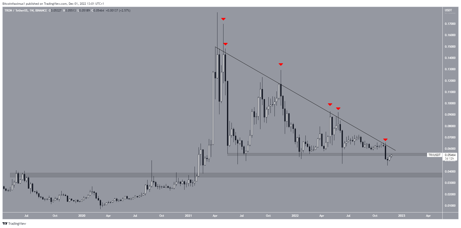 Đến nay, giá TRX đã bị từ chối 6 lần bởi đường kháng cự này (biểu tượng màu đỏ). Lần gần đây nhất là vào ngày 07/11, khi sự sụt giảm diễn ra trên toàn thị trường tiền điện tử. Thời điểm đó, giá TRX cũng đã rơi khỏi khu vực hỗ trợ dài hạn 0.05 USD. Đây được coi là một diễn biến rất tiêu cực vì khu vực này đã hình thành từ tháng 5/2021.