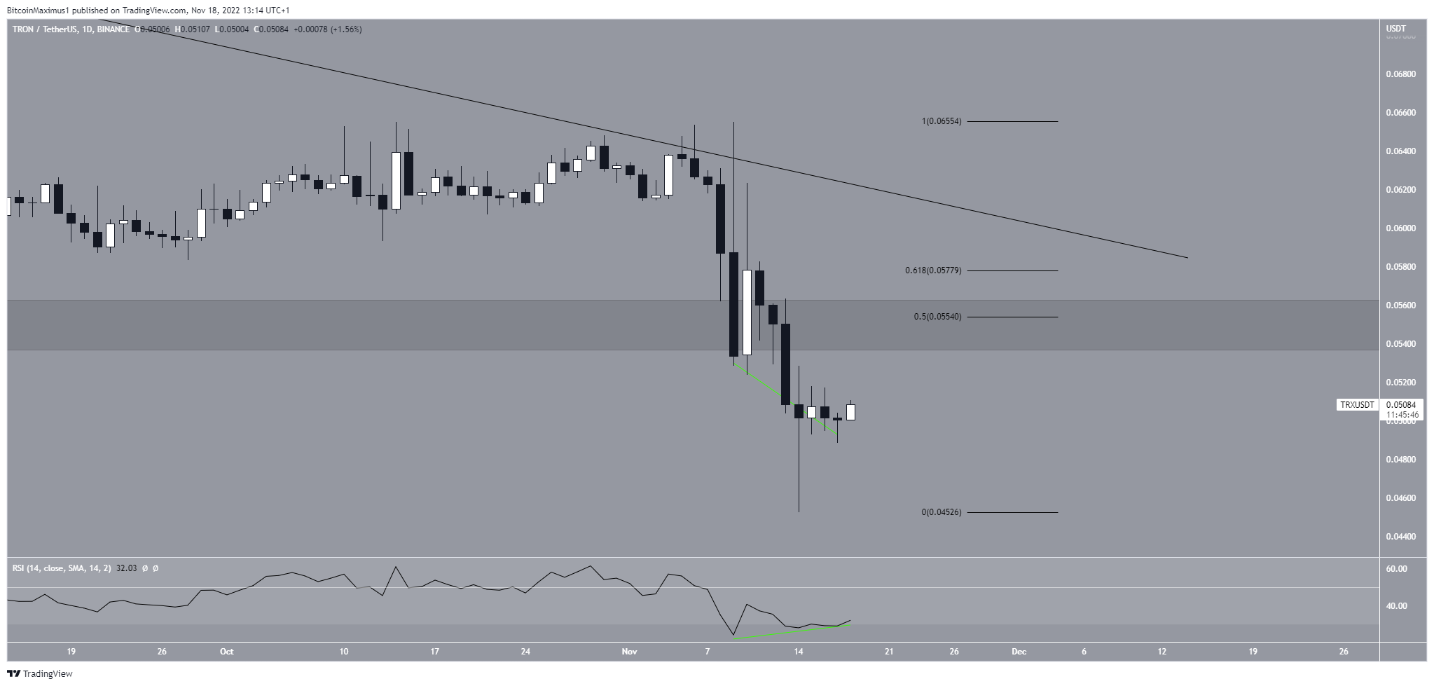 Trước đây, giá đã nhiều lần bị từ chối tại đường này (biểu tượng màu đỏ). Vào ngày 7/11, nó đã tạo một đợt giảm mạnh, khiến giá Tron phá xuống dưới vùng hỗ trợ dài hạn 0.055 USD. Việc này cũng khiến chỉ báo RSI rơi khỏi mức 50, xác nhận một xu hướng giảm giá.