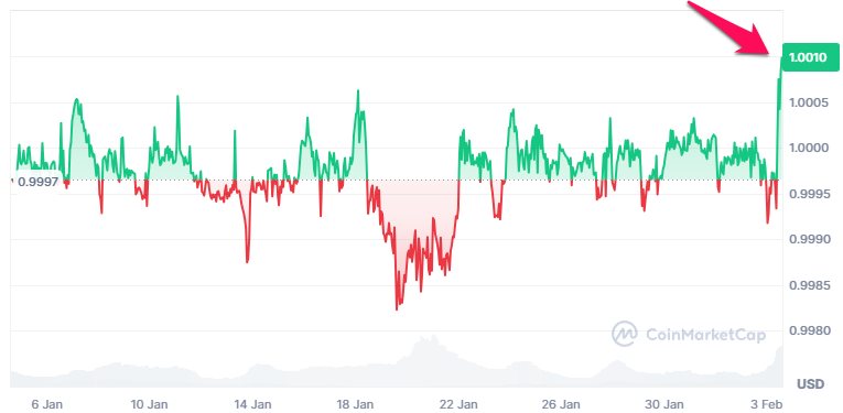 Cho đến thời điểm bài viết, giá USDT/VND vẫn giữ trên mức 26,000 VND cả bên mua lẫn bên bán. Không chỉ tại thị trường Việt Nam, mà dữ liệu CoinMarketCap cho thấy giá USDT/USD có khuynh hướng tăng đầu tháng 2. Cụ thể, USDT/USD đã vượt hơn 1 USD và đạt mức cao nhất trong một tháng qua, phản ánh nhu cầu USDT có sự đột biến.