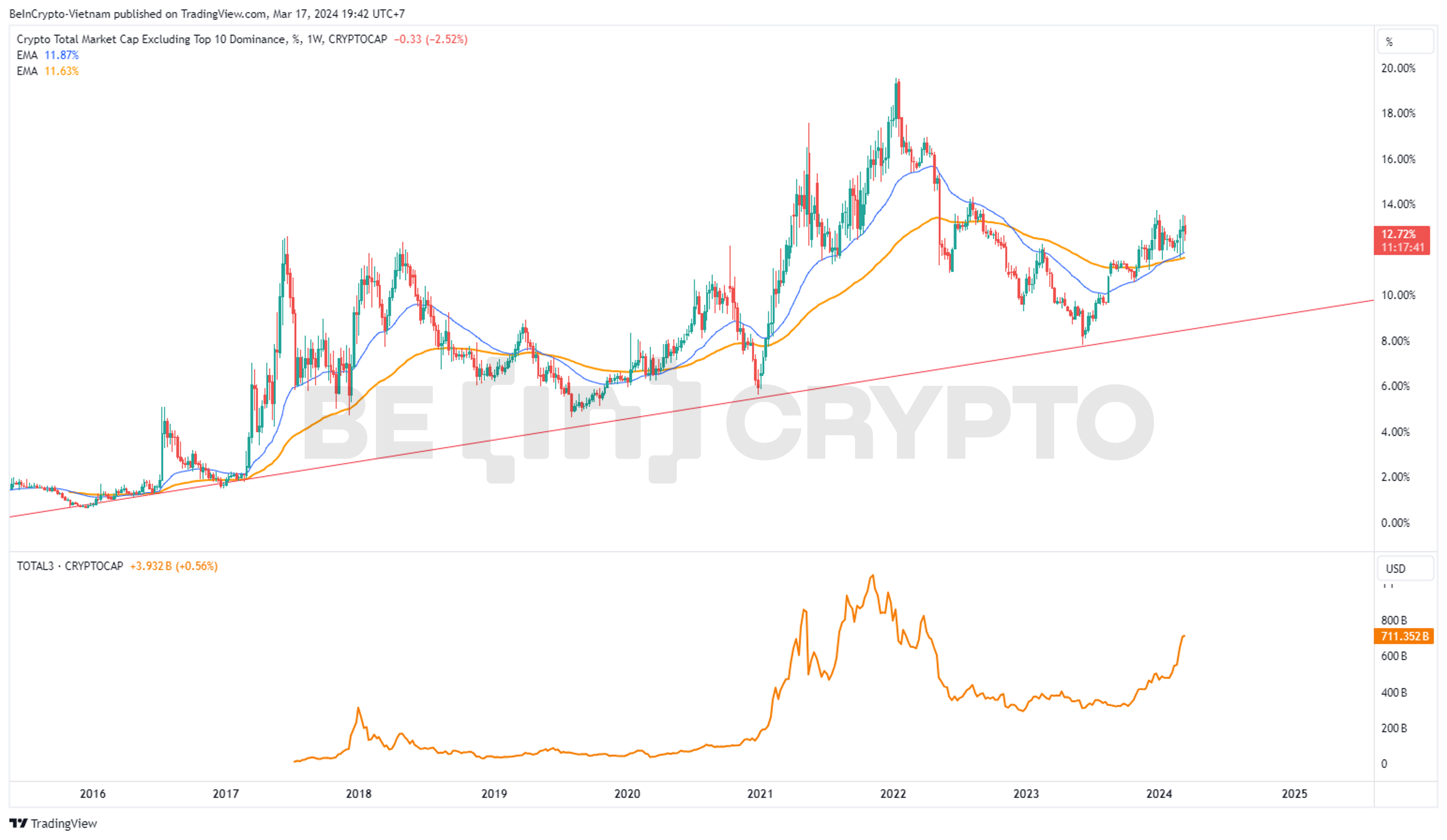 Dưới góc nhìn kỹ thuật, OTHER Dominance (tỷ trọng vốn hóa Altcoin không kể TOP10) vẫn duy trì trong xu hướng tăng từ giữa năm 2023 đến nay, hiện đạt gần 13%. Đến đầu năm 2024, OTHER Dominance xác nhận tín hiệu kỹ thuật tăng giữa EMA34 và EMA89 khung tuần. Tỷ trọng OTHER tăng đồng nghĩa Altcoin (không kể TOP10) ngày càng tăng giá.