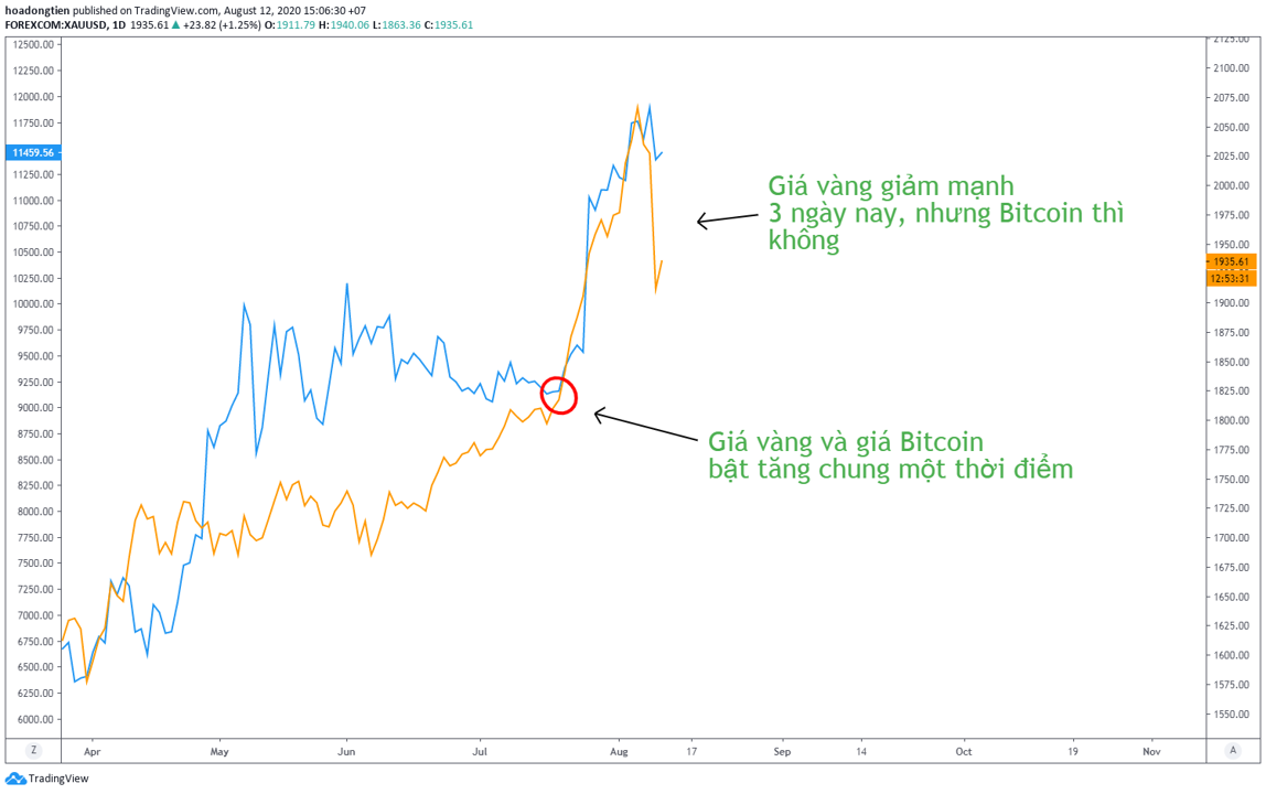 Lùi lại quá khứ hồi giữa tháng 7, cả hai gần như đều đã bật tăng chung một thời điểm. Kể từ sau đó, Bitcoin thì vượt 10.300 đô la và giá vàng vượt mốc cao nhất trong lịch sử.