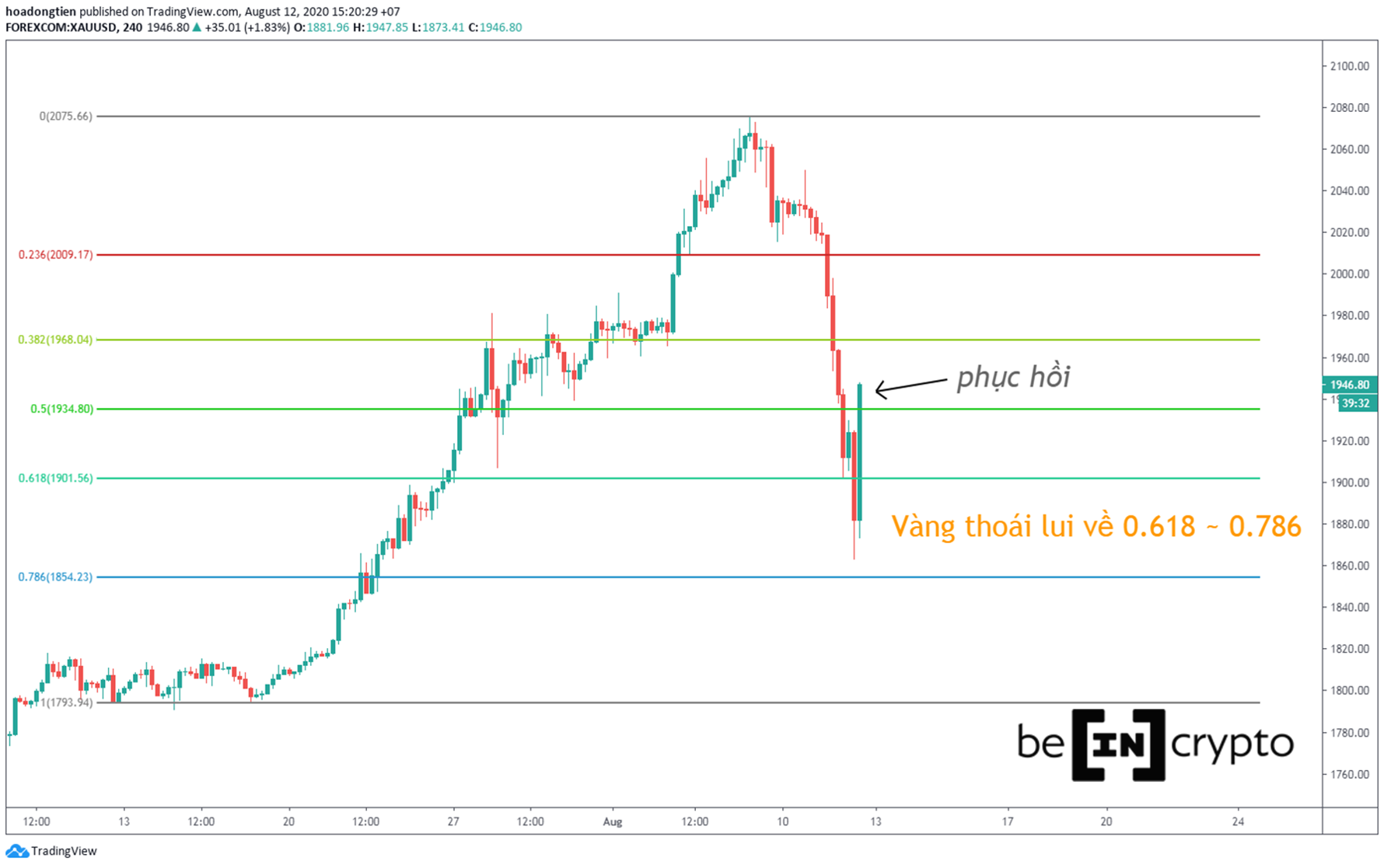 Ở mức trên 2000 đô la là một sự thái quá tạm thời của biến động giá. Phân tích kỹ thuật cho thấy, sự thái quá đã phải trả giá bằng cách trả lại mức trung bình cho biến động như một quy luật chung thường gặp. Giá đã về lại mức sâu ở fibo 0.618 và 0.786.