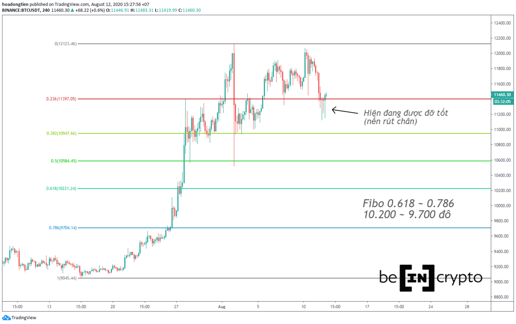 Tương ứng, mức fibo 0.618 ~ 0.786 của Bitcoin sẽ nằm ở mức giá 10.200 đến 9.700 đô la.