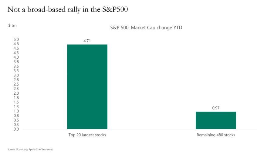 SP500 tăng cao thời gian vừa qua nhưng thực chất không đồng đều. Sự mất cân đối này khá sâu sắc khi hiệu suất của TOP20 “kéo” cả phần còn lại. Trong TOP20 này là những công ty công nghệ (Apple, Microsoft, NVIDIA, Meta…) hưởng lợi từ làn sóng tuệ nhân tạo (AI) gây xôn xao toàn cầu.